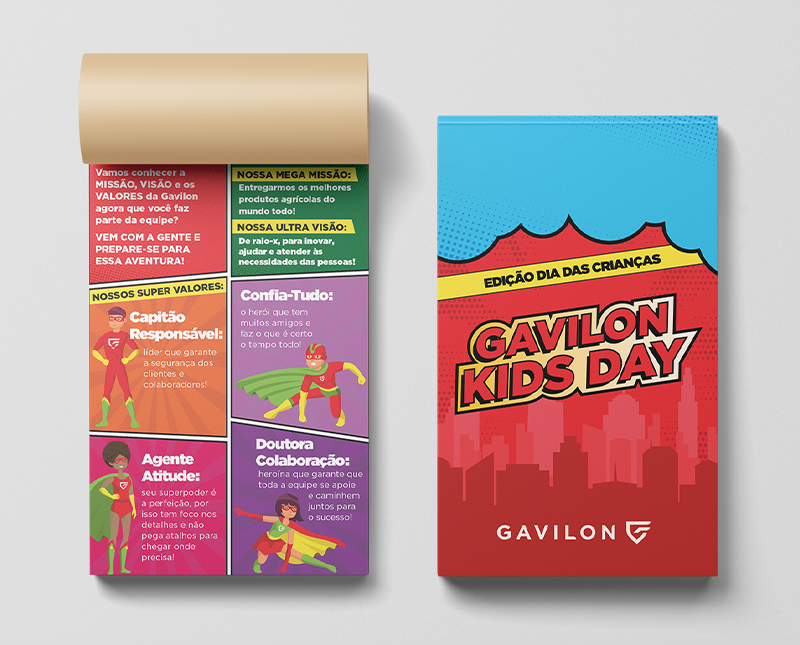 Criamos o "Gavilon Kids Day", uma experiência personalizada para os filhos dos colaboradores. Cada criança recebeu em casa uma “cartinha de admissão”, um crachá e um bloquinho personalizados na temática pop-art, além do convite para uma reunião online especial. Inspirados no universo dos quadrinhos, transformamos a missão, visão e valores da empresa em uma narrativa heroica, com personagens como Capitão Responsável, Confia-Tudo, Agente Atitude e Doutora Colaboração.